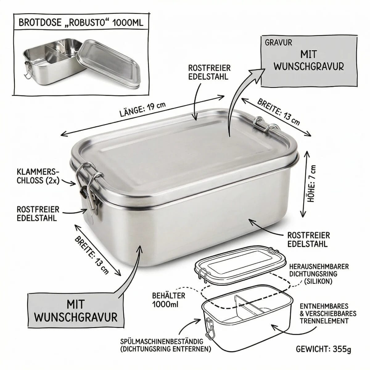 Suchst Du nach dem perfekten, personalisierten Geschenk? Entdecke die ROMINOX® Lunchbox „Robusto“! Aus rostfreiem Edelstahl gefertigt, bietet sie 1000 ml Platz für Deine Mahlzeiten. Dank des entnehmbaren Trennelements teilst Du sie leicht in zwei Bereiche. Der herausnehmbare Dichtungsring sorgt für Dichtheit, sollte aber vor dem Spülen entfernt werden. Ob Schule, Studium oder Büro – „Robusto“ ist Dein stilvoller Begleiter. Und das Beste? Wir gravieren sie für Dich! Ein Geschenk, das Eindruck hinterlässt.