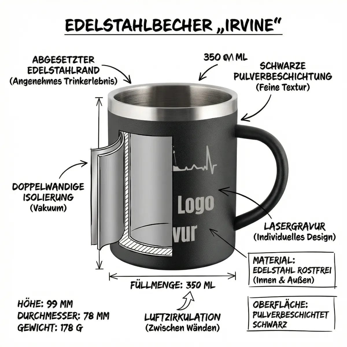 Dieser Becher aus Edelstahl ist perfekt für das Büro, Zuhause oder als Geschenk. Die doppelwandige Tasse ist mit schwarzer Pulverbeschichtung versehen, hat ein Fassungsvermögen von 350ml und wird mit einer Gravur ein tolles personalisiertes Geschenk.