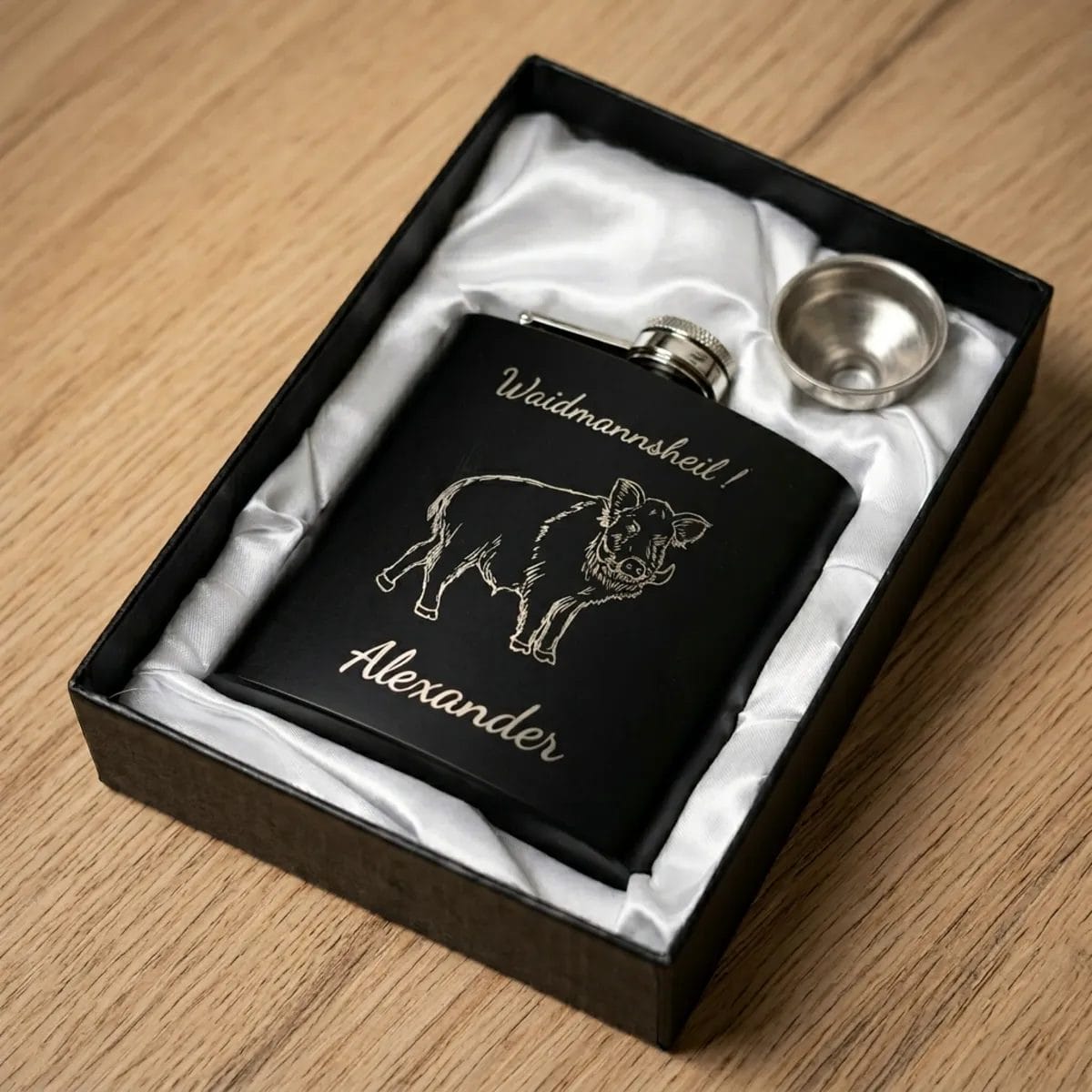 Der schwarze Flachmann mit Gravur ist das perfekte Geschenk für jeden Anlass. Mit einer Fassungsvermögen von 150ml, ist er der ideale Begleiter für unterwegs. Personalisiere deinen Flachmann mit einer Gravur nach deinen Wünschen und mache ihn zu einem einzigartigen Geschenk oder auch als Werbemittel für deine Kunden. Ob als Geschenkidee für Freunde oder Geschäftspartner, mit diesem Flachmann kannst du nichts falsch machen.