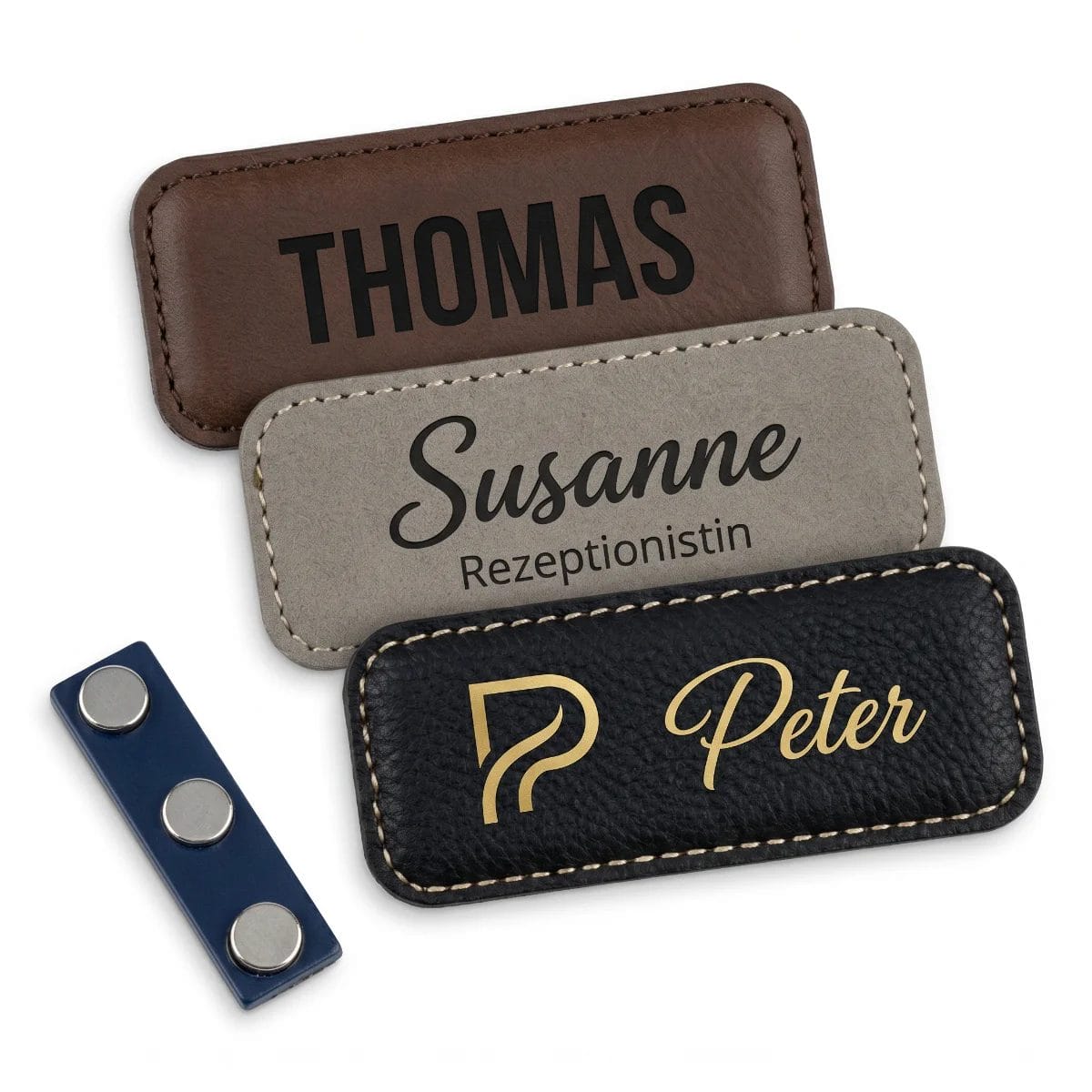 Ein Namensschild ist mehr als nur eine Kennzeichnung – es ist oft der erste Eindruck. Aus einem schlichten Rohling aus hochwertigem PU Kunstleder entsteht in unserer Fertigung mit viel Präzision dein persönliches Einzelstück. Erst nach deiner Bestellung wird das Schild individuell gestaltet und mittels Laser dauerhaft markiert.